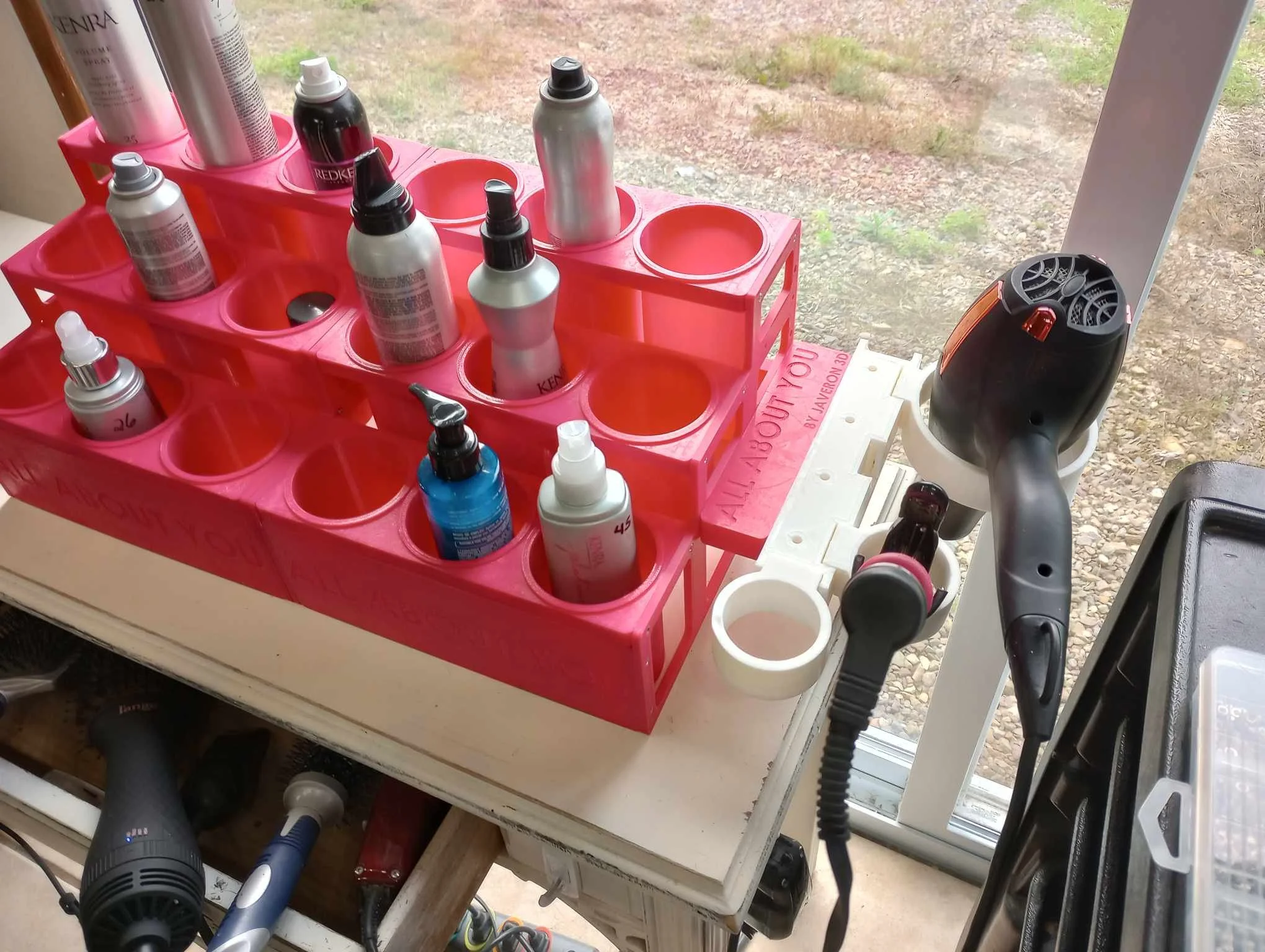 this was designed and printed for a salon to keep cans from falling over and to give a more convenient place for the hair dryer and related accessories